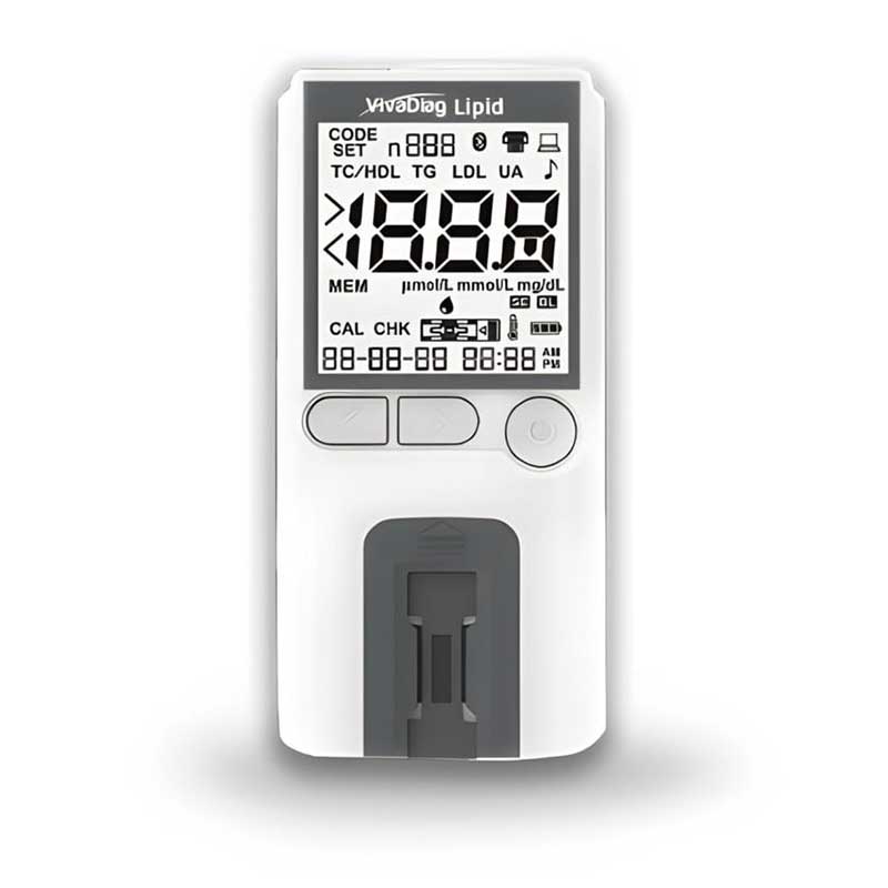 VivaDiag Cholesterol and Triglyceride Meter is designed for the quantitative determination of lipid parameters from capillary or venous whole blood, plasma, and serum. This device stands out with clinically validated accuracy, and only 25 μL of blood sample is required to measure and calculate all 5 parameters at once – significantly less than with similar devices from other manufacturers.